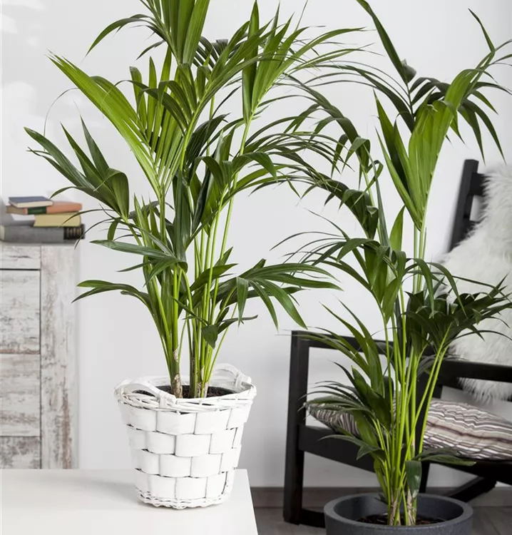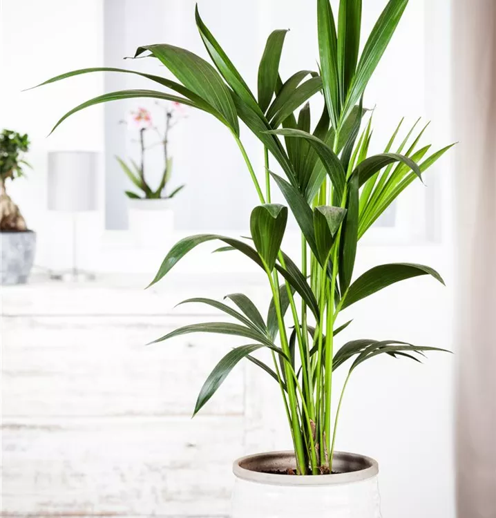 Die Kentiapalme (Howea forsteriana) trägt dunkelgrüne, tief geschlitzte Blätter. Diese aufrechte Pflanze gedeiht am besten an einem halbschattigen Standort.