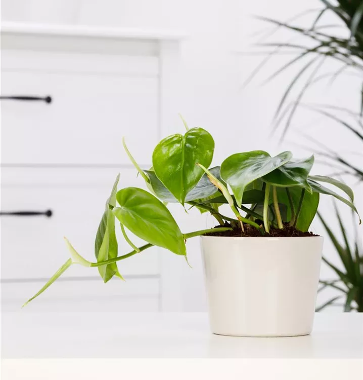 Der Philodendron (Philodendron scandens) trägt dunkelgrüne, herzförmige Blätter. Diese rankende Pflanze gedeiht am besten an einem hellen bis schattigen Standort.