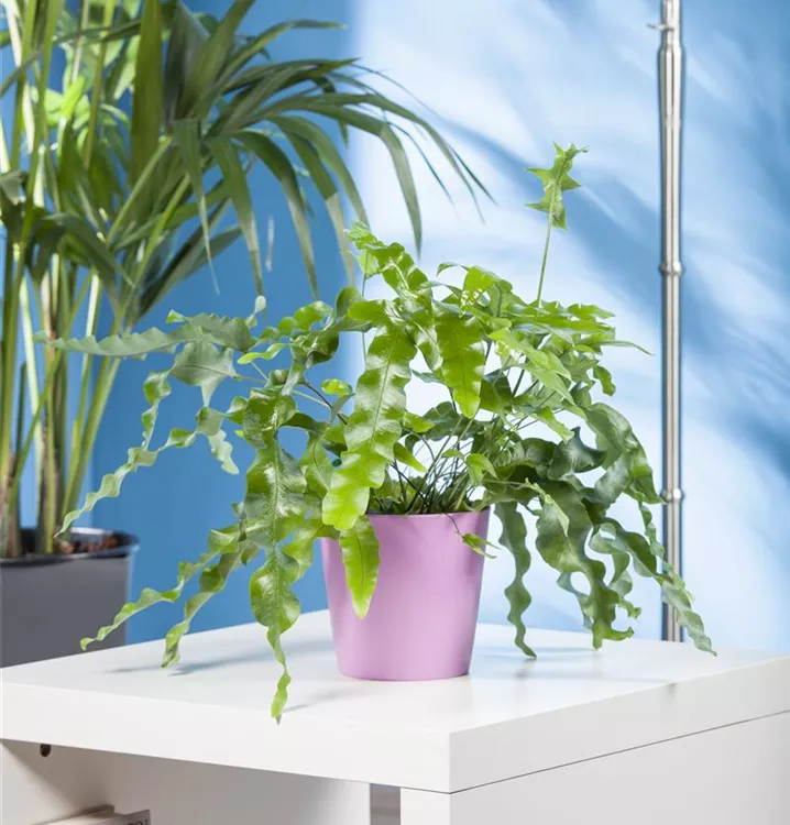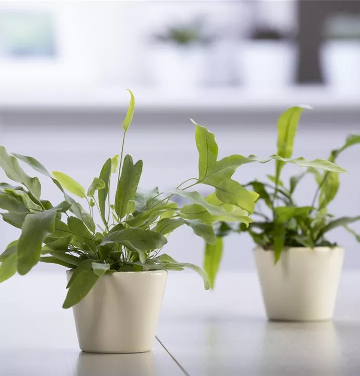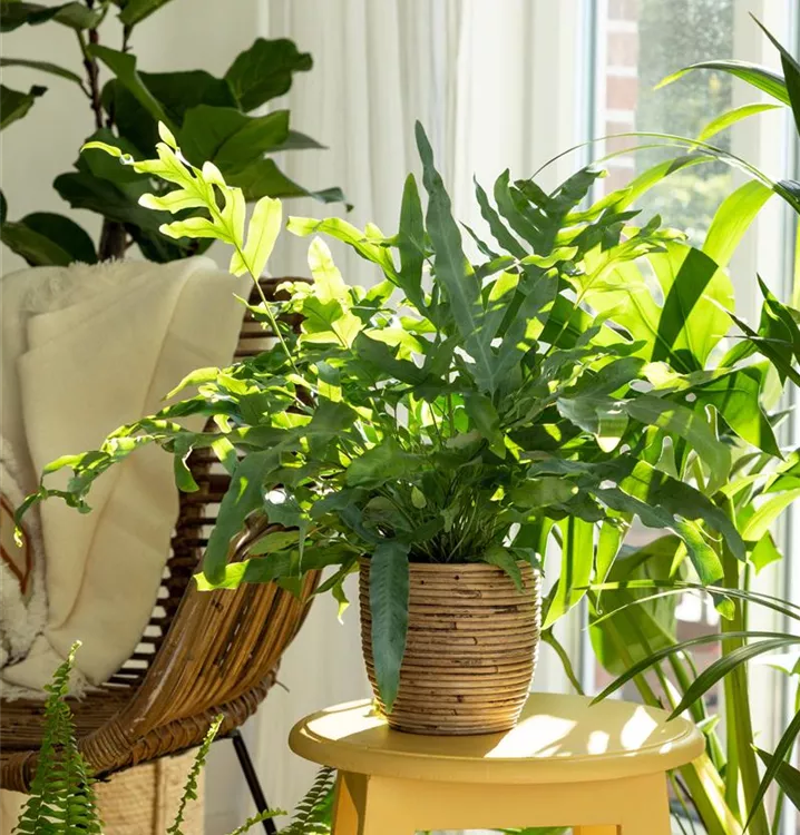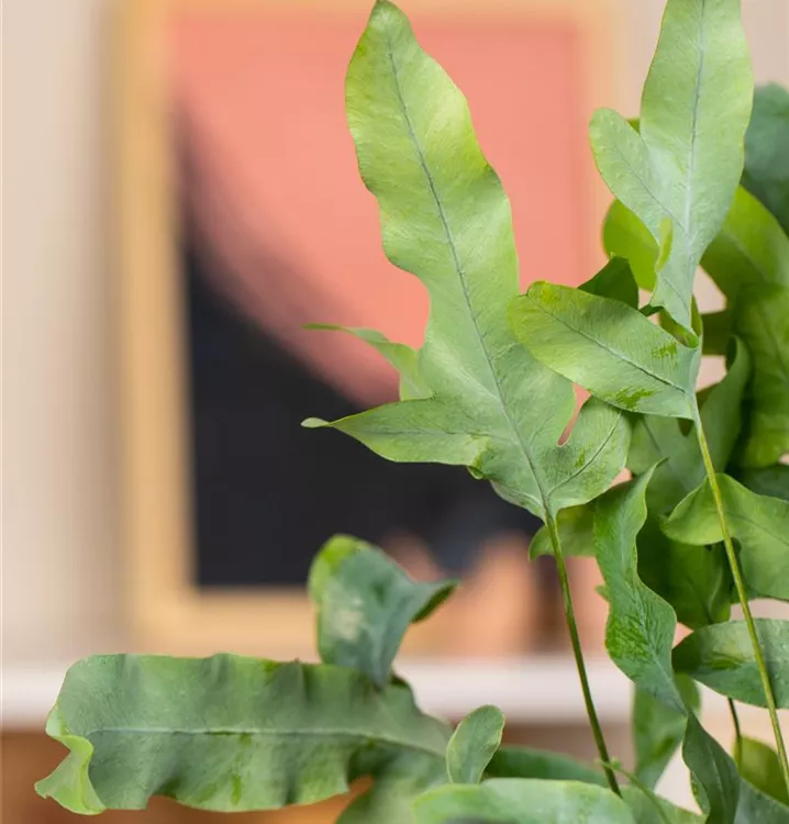 Der Goldene Hasenfußfarn (Phlebodium aureum) ist mit seinen gefingerten, dunkelgrünen Blattwedeln eine dekorative Zimmerpflanze. An einem hellen Standort un in einer humosen, lockeren Erde fühlt er sich am wohlsten. Bei günstigen Bedingungen erreicht dieser Farn eine Höhe von ca. 40 cm und wird bis zu 80 cm breit.