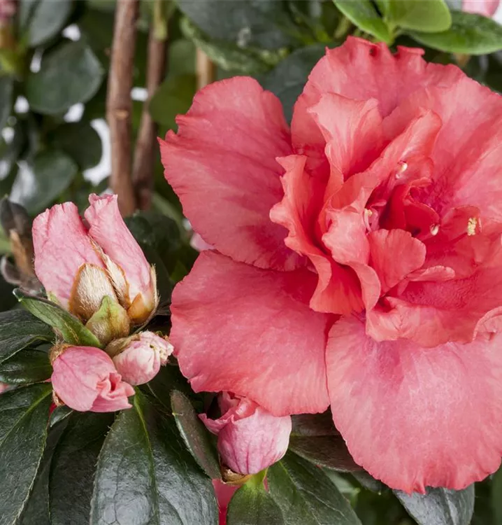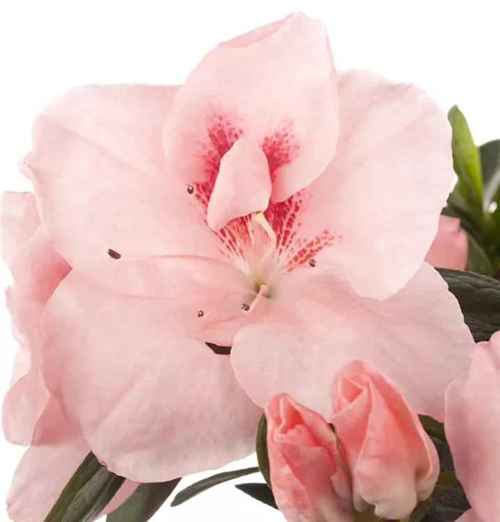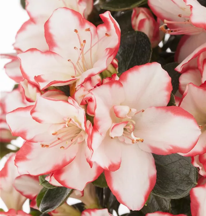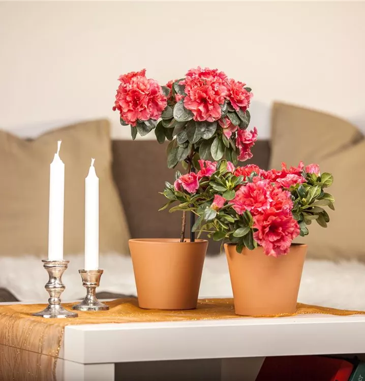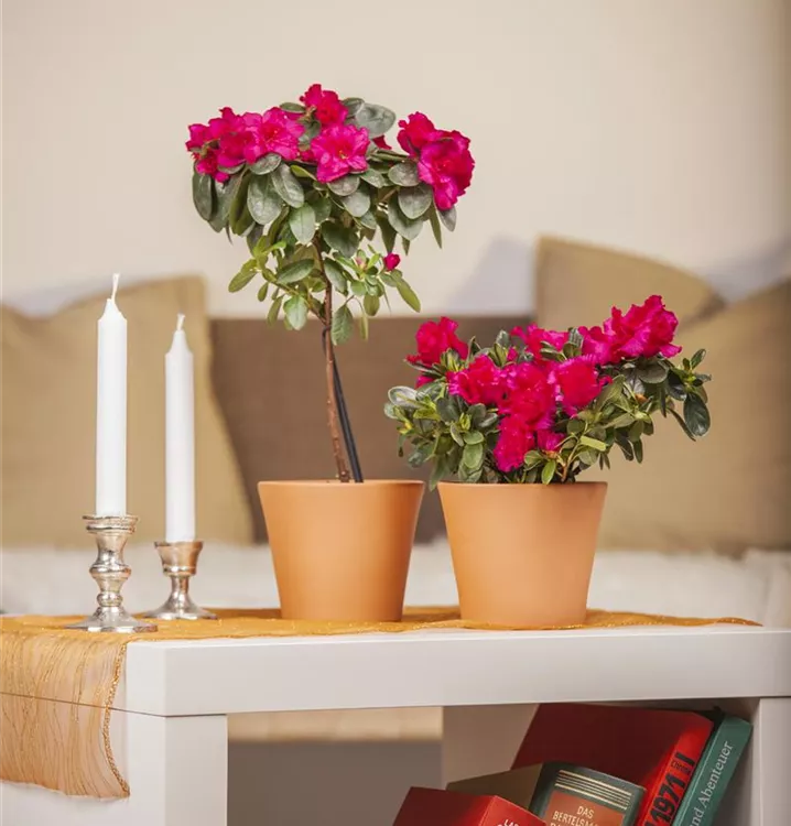 Die Indische Azalee (Rhododendron simsii) blüht über Monate hinweg. Je nach Sorte, erscheinen die dekorativen Blüten in den Farben Rosa, Rot und Weiß. Die dunkelgrünen, lanzettlichen Blätter sind ganzrandig. Bevorzugt wird ein sonniger bis halbschattiger Standort und eine durchlässige Erde.