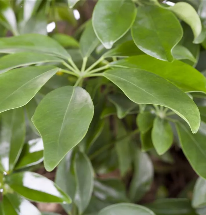 Die Strahlenaralie (Schefflera arboricola) trägt dunkelgrüne, handförmige Blätter. Diese strauchartige Pflanze gedeiht am besten an einem sonnigen bis halbschattigen Standort.