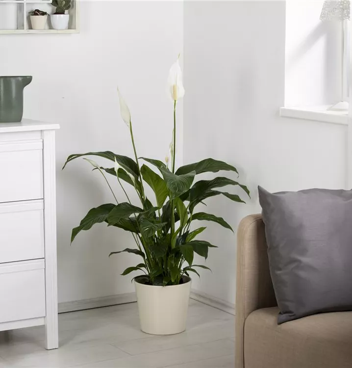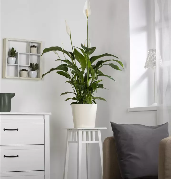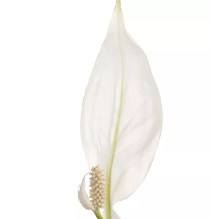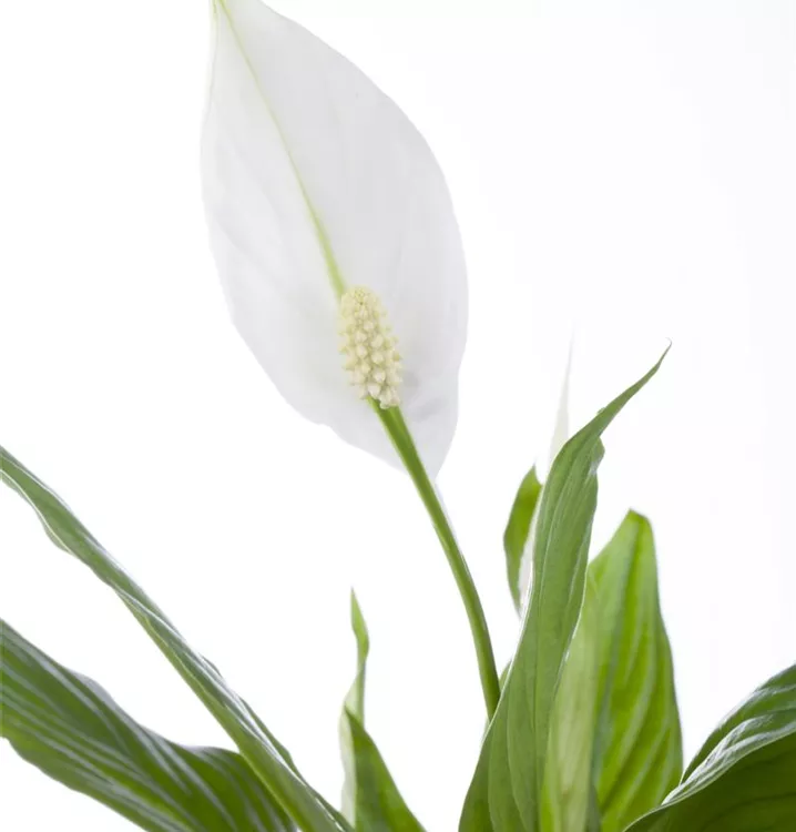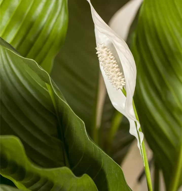 Die weißen Blüten der Blattfahne erscheinen in Kolben von Januar bis Dezember.