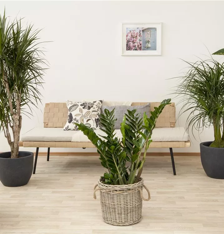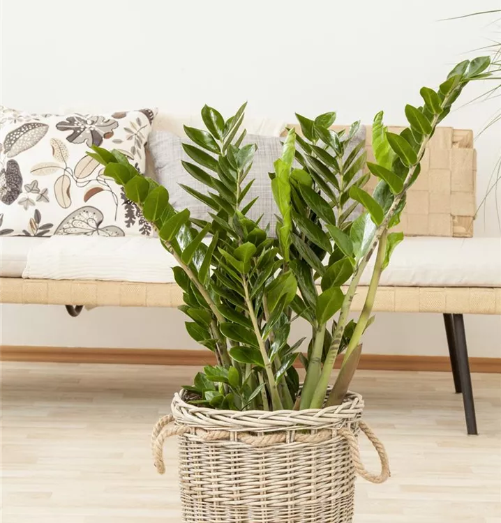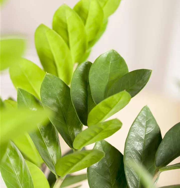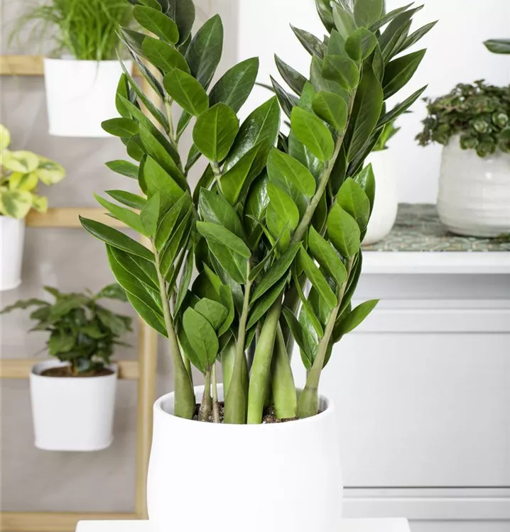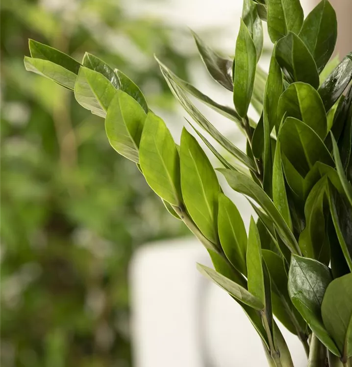 Die Glücksfeder (Zamioculcas zamiifolia) trägt dunkelgrüne Blätter. Diese aufrechte und rhizombildende Pflanze gedeiht am besten an einem schattigen Standort.