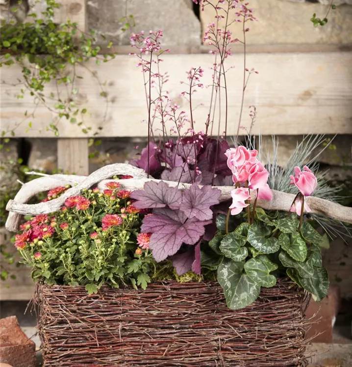 Das Herbst-Alpenveilchen (Cyclamen hederifolium) blüht über Monate hinweg. Je nach Sorte, erscheinen die dekorativen Blüten in den Farben Pink, Weiß und Rosa. Die grün-weißen, herzförmigen Blätter sind ganzrandig. Bevorzugt wird ein sonniger bis halbschattiger Standort und eine durchlässige Erde.