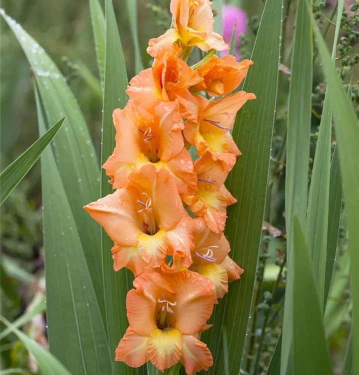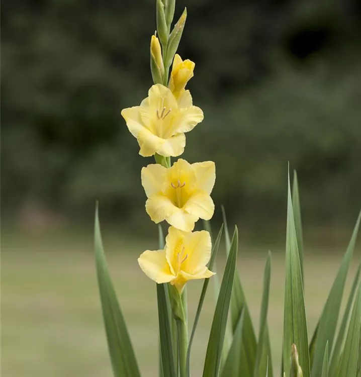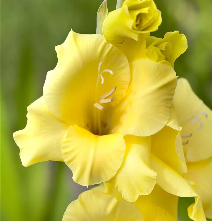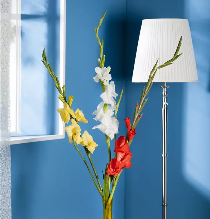 Die Gladiole (Gladiolus) blüht über Monate hinweg. Je nach Sorte, erscheinen die dekorativen Blüten in den Farben Weiß, Rosa und Gelb. Bevorzugt wird ein sonniger bis halbschattiger Standort und eine durchlässige Erde.