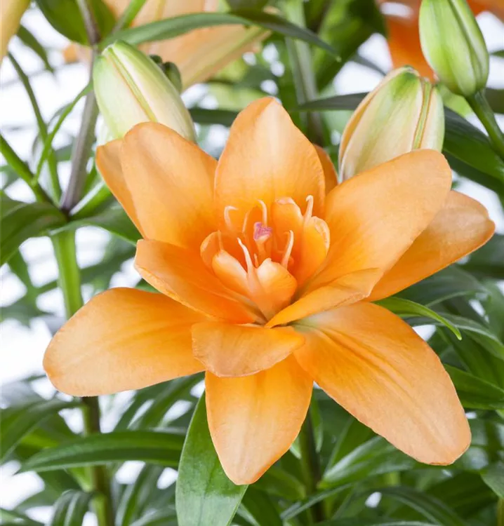 Die Lilie (Lilium) bringt ansehnliche, weiße, gelbe, orangefarbene, rote, angenehm duftende Blüten von Mai bis September hervor. Bevorzugt wird ein durchlässiger, humoser Boden in sonniger bis halbschattiger Lage. Die aufrechte Pflanze erreicht gewöhnlich eine Höhe von 0,4 - 1,8 m und wird bis zu 15 cm breit.