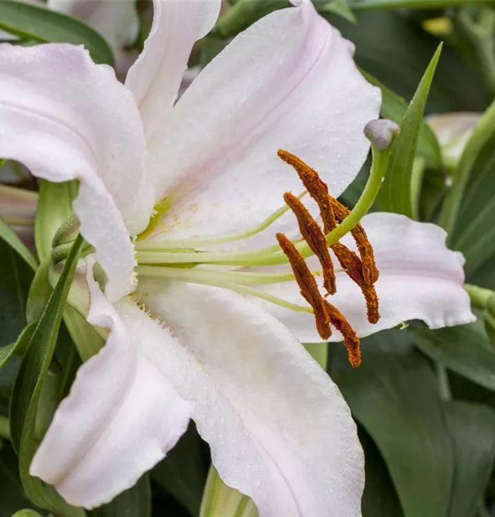 Die sommergrünen Blätter der Lilie sind dunkelgrün, lanzettlich.