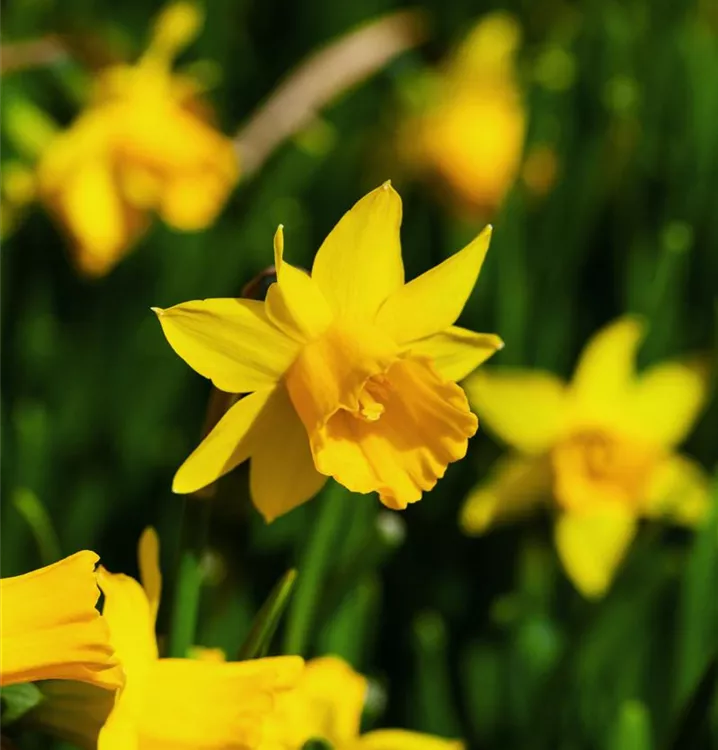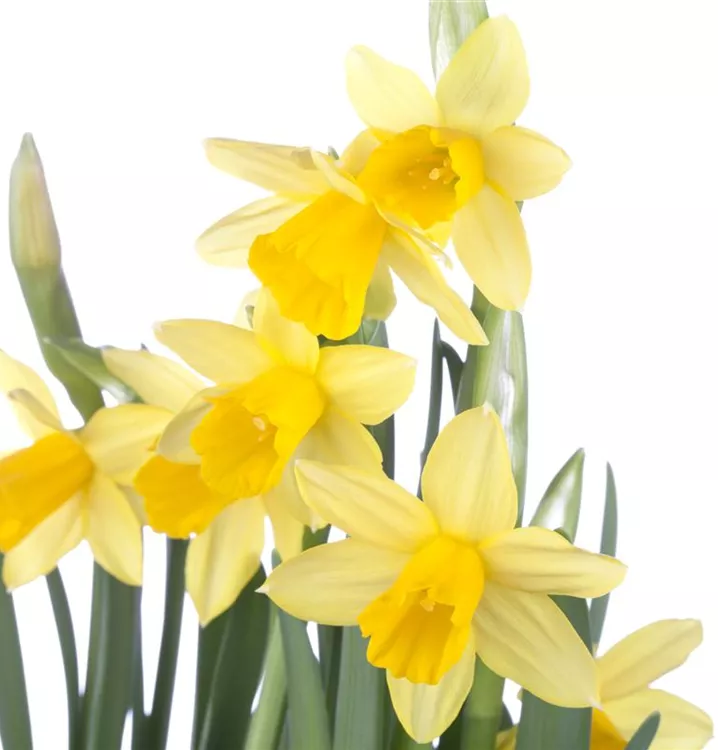 Die gelben, radförmigen oder röhrenförmigen Blüten der Alpenveilchenartigen Garten-Narzisse 'Tête à Tête' erscheinen in Trauben von März bis April. Diese sind angenehm duftend.