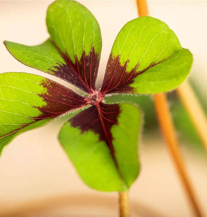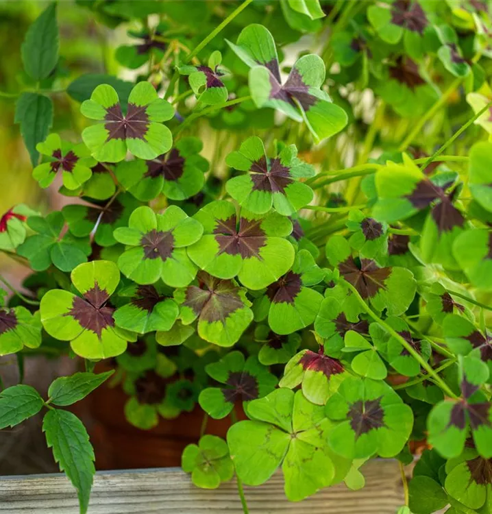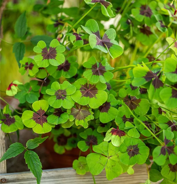 Die sommergrünen Blätter des Glücksklees sind zweifarbig, herzförmig.
